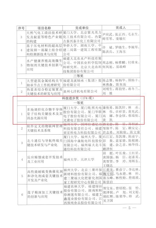 2018年10月31日,福建省人民政府發(fā)文公布2017年度福建省科學(xué)技術(shù)獎勵和專利獎勵的決定。其中乾照光電與廈門大學(xué)、廈門華聯(lián)電子股份有限公司、廈門光莆電子股份有限公司聯(lián)合申報的“多場調(diào)控化合物半導(dǎo)體量子結(jié)構(gòu)關(guān)鍵技術(shù)及其固態(tài)光源應(yīng)用”從454項科技進(jìn)步獎項目中脫穎而出,榮獲福建省科技進(jìn)步獎一等獎。