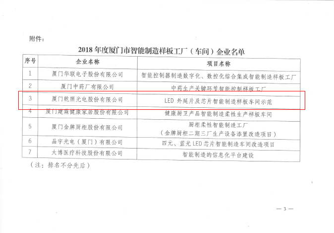 2018年,乾照光電在紅黃光領(lǐng)域,堅持“擴產(chǎn)+擴充高端產(chǎn)品”的發(fā)展戰(zhàn)略;在藍綠光領(lǐng)域,實施“全面擴產(chǎn),規(guī)模跟隨”的布局戰(zhàn)略,爭取做行業(yè)龍頭。通過自身努力獲得了行業(yè)的廣泛認可。2018年,乾照光電的LED外延片及芯片智能制造項目更是榮獲國家工信部智能制造試點示范項目、福建省經(jīng)信委智能制造試點示范項目、廈門市智能制造樣板工廠(車間)示范等一系列榮譽。