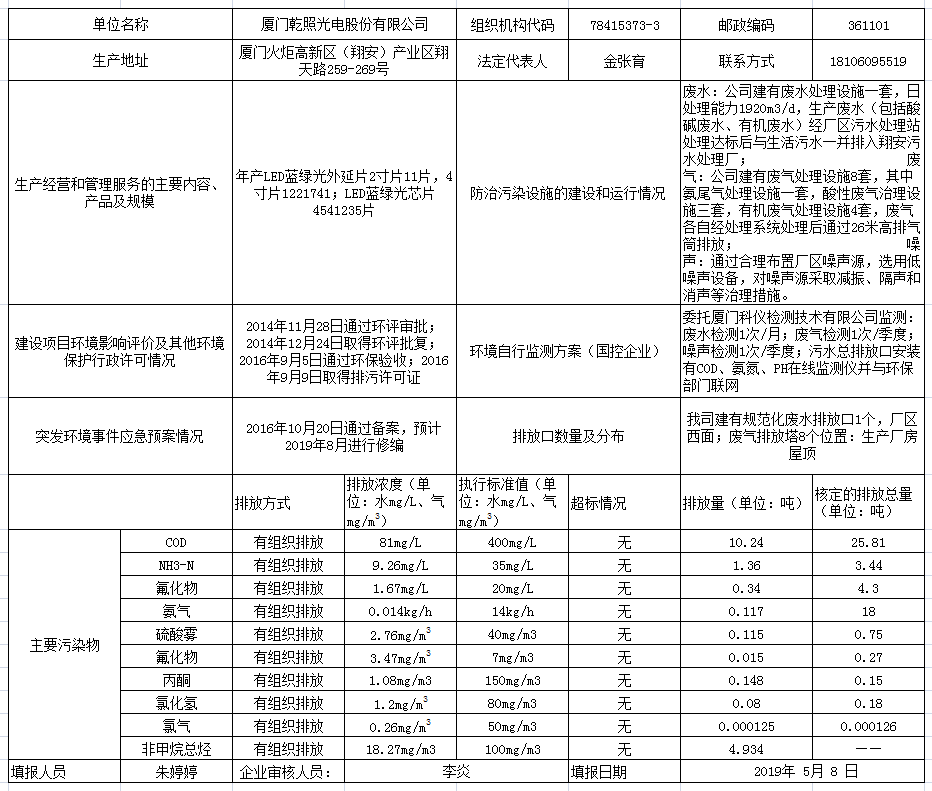 廈門乾照光電股份有限公司環(huán)境信息表