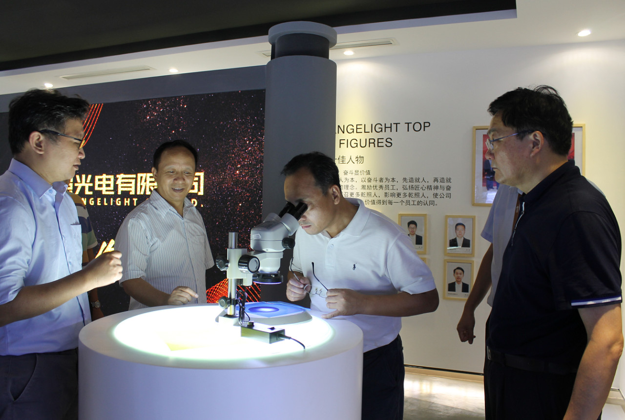 隨后,巡視組一行參觀了公司展廳。馬祥柱為大家講述了揚州乾照光電創(chuàng)業(yè)十年的歷程、成績以及榮譽,并介紹了公司各類產(chǎn)品的型號、樣式以及應用領域。巡視組成員們通過顯微鏡觀察了公司芯片成品芯粒,對一片四寸圓片能切出幾十萬顆芯粒的生產(chǎn)工藝贊嘆不已。