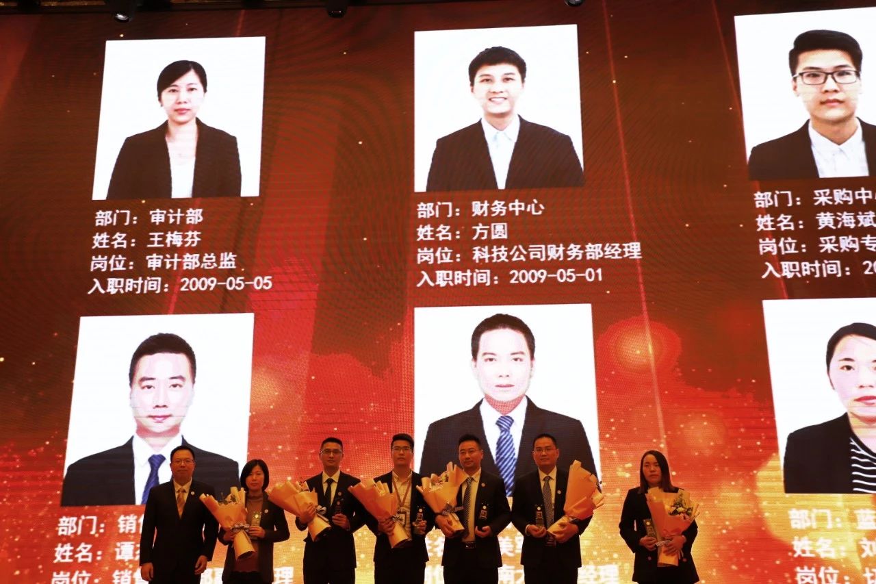 總結(jié)報(bào)告后,公司對(duì)2019年工作中表現(xiàn)突出的個(gè)人和團(tuán)隊(duì)進(jìn)行了表彰。此次表彰共設(shè)置了最佳新人獎(jiǎng)、基層骨干獎(jiǎng),技術(shù)精英獎(jiǎng)、管理卓越獎(jiǎng)、優(yōu)秀部門(mén)獎(jiǎng)、優(yōu)秀班組獎(jiǎng)、科技進(jìn)步獎(jiǎng)、十年員工、黨支部?jī)?yōu)秀黨員獎(jiǎng)、“乾照十佳人物”等十大獎(jiǎng)項(xiàng),共計(jì)79人獲個(gè)人獎(jiǎng)項(xiàng),12個(gè)團(tuán)隊(duì)獲團(tuán)體獎(jiǎng)項(xiàng)。按照往年慣例,“乾照十佳人物”的頒獎(jiǎng)環(huán)節(jié)由董事長(zhǎng)金章育親自主持并為獲獎(jiǎng)人員一一頒獎(jiǎng),總裁蔡海防為十年員工頒發(fā)十年紀(jì)念金幣。