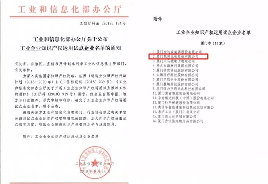 入選國家工業(yè)和信息化部公布的“工業(yè)企業(yè)知識產(chǎn)權(quán)運用試點企業(yè)名單”