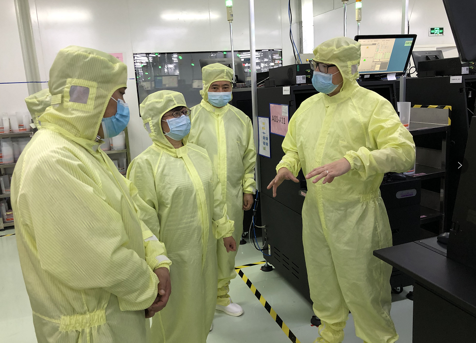 在公司展廳,陳文戎向調(diào)研組一行介紹了公司發(fā)展歷程、生產(chǎn)經(jīng)營狀況以及產(chǎn)品技術(shù)優(yōu)勢和應(yīng)用領(lǐng)域。在車間,調(diào)研組一行觀摩了外延片生產(chǎn)相關(guān)工藝流程及芯片點測、分選流程,對公司的現(xiàn)代化智能生產(chǎn)技術(shù)和設(shè)備的運作程序給予了充分肯定。