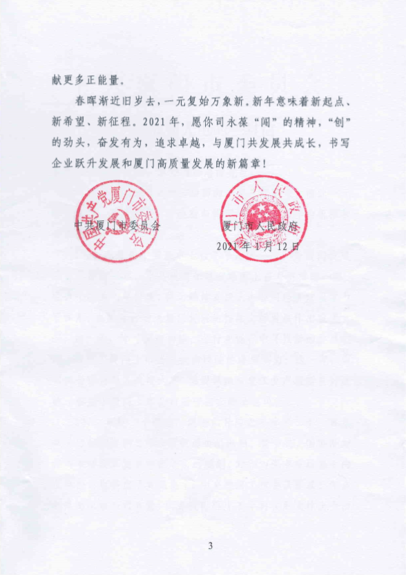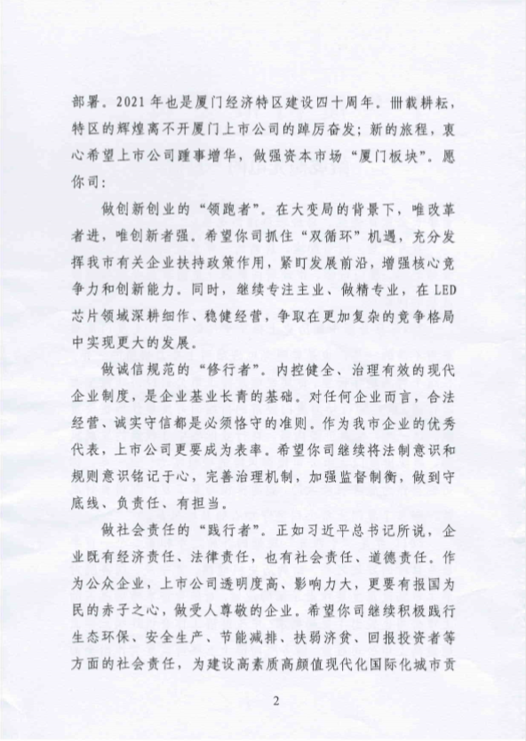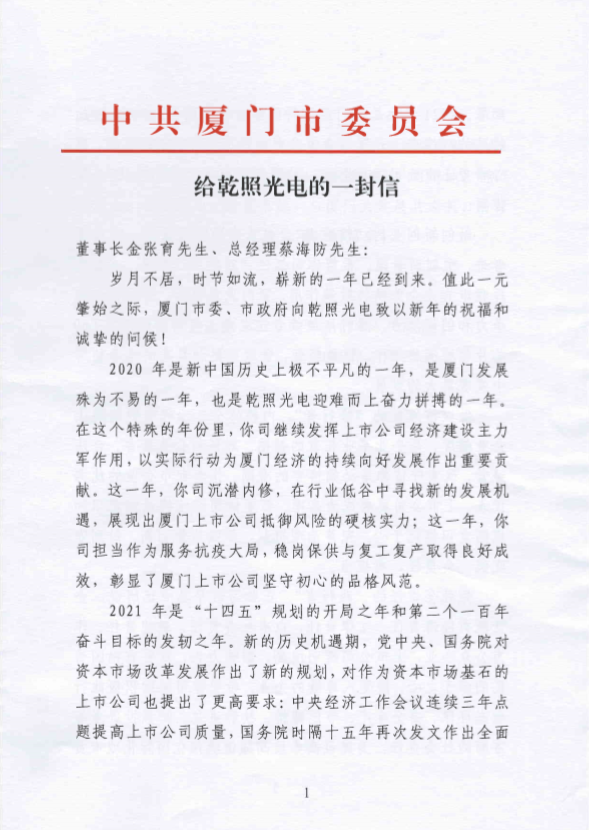近日,乾照光電收到中共廈門(mén)市委員會(huì)的來(lái)信,信中廈門(mén)市委、市政府對(duì)于我司過(guò)去一年的發(fā)展給予了積極的評(píng)價(jià),并在一元肇始之際,對(duì)我司表達(dá)了新年的祝福和誠(chéng)摯的問(wèn)候,同時(shí)就我司2021年的發(fā)展規(guī)劃做出重要指引。