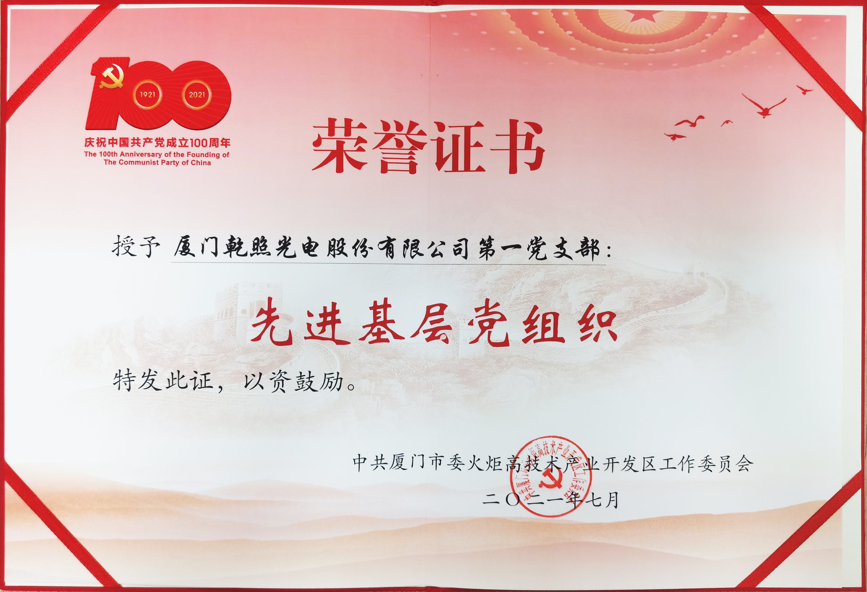 廈門乾照光電第一黨支部榮獲“先進(jìn)基層黨組織”稱號