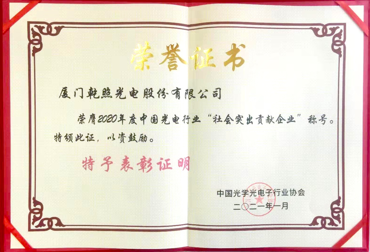 廈門乾照光電榮獲“2020年度中國光電行業(yè)‘社會突出貢獻(xiàn)企業(yè)’”稱號