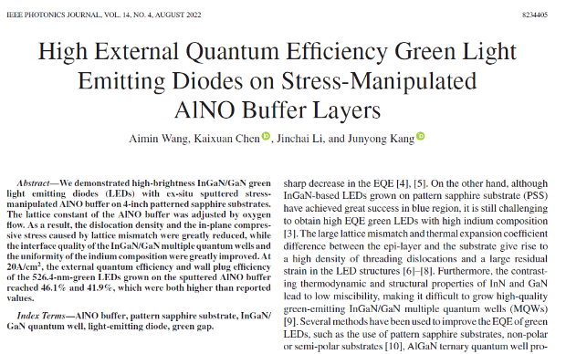 8月份,廈門(mén)大學(xué)物理科學(xué)與技術(shù)學(xué)院與乾照光電協(xié)同攻關(guān),在提升綠光LED效率方面取得重大進(jìn)展。該研究成果以“High External Quantum Efficiency Green Light Emitting Diodes onStress-Manipulated AlNO Buffer Layers”為題發(fā)表于IEEE PHOTonICSJOURNAL 14(4) (2022) 8234405。廈門(mén)大學(xué)康俊勇教授與乾照光電陳凱軒博士團(tuán)隊(duì)經(jīng)過(guò)3年的聯(lián)合攻關(guān),提出通過(guò)并入高濃度氧形成AlNO緩沖層的方法,降低圖形化藍(lán)寶石襯底與GaN外延層間晶格失配導(dǎo)致的應(yīng)力與缺陷,進(jìn)而減緩了MQW中阱/壘的應(yīng)力及其壓電極化效應(yīng),提升了阱/壘界面的陡峭度,提高了阱中In組分的一致性,最終提高了LED的光電轉(zhuǎn)換效率。