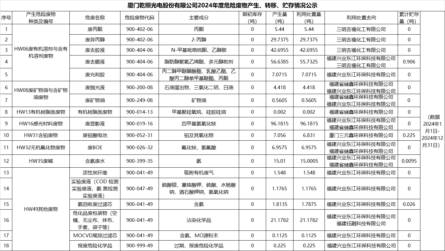 廈門乾照光電股份有限公司2024年度危險(xiǎn)廢物產(chǎn)生、轉(zhuǎn)移、貯存情況公示