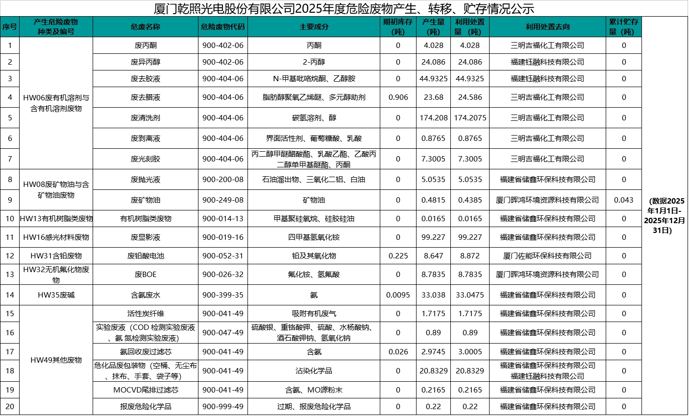 廈門乾照光電股份有限公司2025年度危險廢物產(chǎn)生、轉(zhuǎn)移、貯存情況公示
