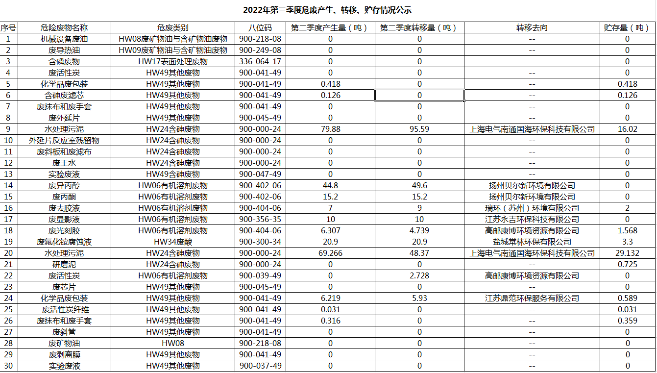 揚(yáng)州乾照光電有限公司2022年第三季度危廢產(chǎn)生、轉(zhuǎn)移、貯存情況公示