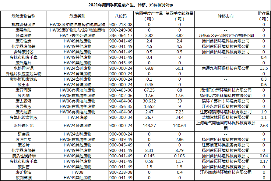 揚州乾照光電有限公司2021年第四季度危廢產(chǎn)生、轉(zhuǎn)移、貯存情況公示
