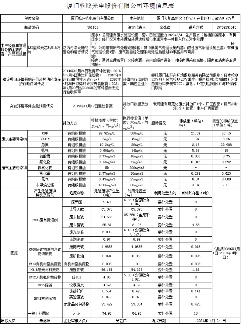 揚州乾照光電有限公司2021年第一季度危廢產(chǎn)生、轉(zhuǎn)移、貯存情況公示