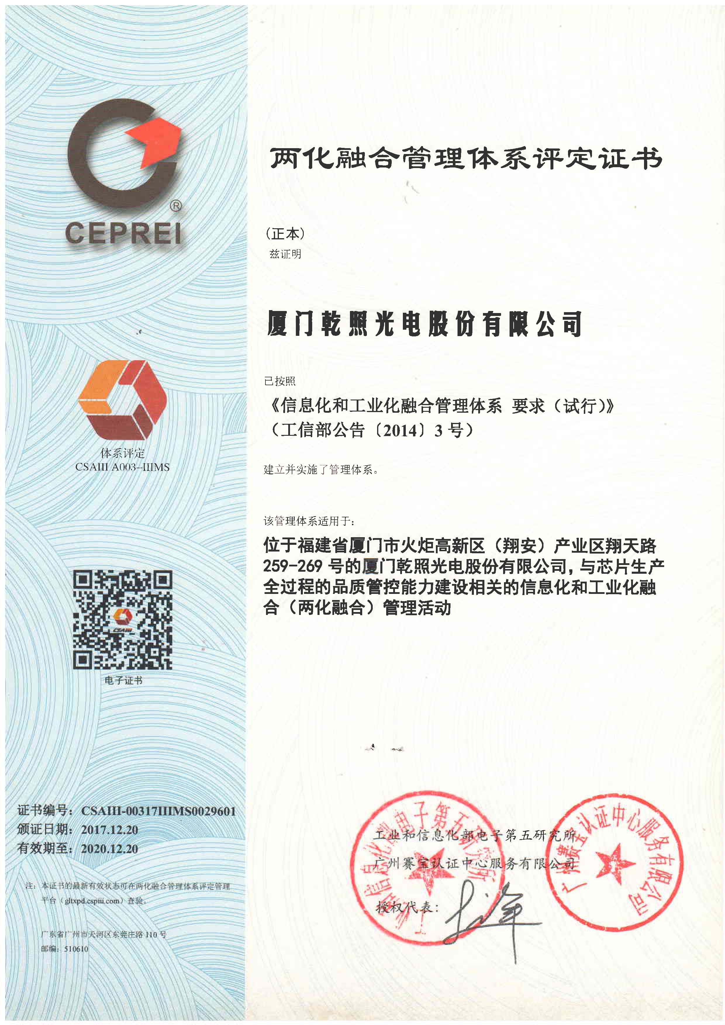 乾照光電獲得兩化融合管理體系評(píng)定證書(shū)